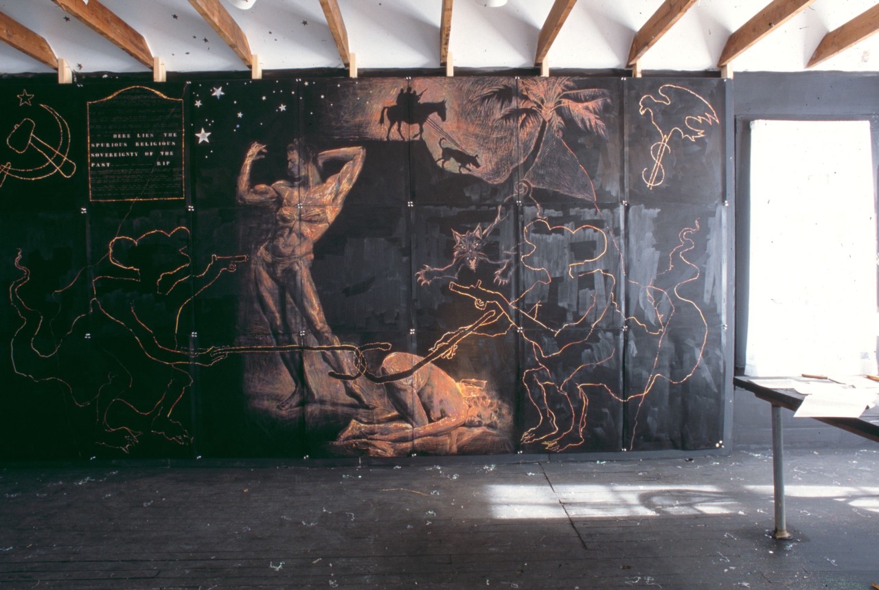 Incised eight coats varied color priming on reclaimed aluminum offset litho sheets with chalk marking by project visitors, 31” X 27” each of 21 panels, 1998.